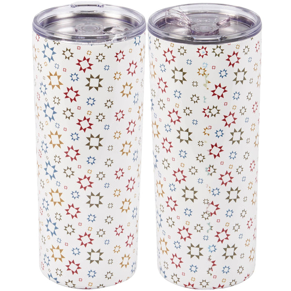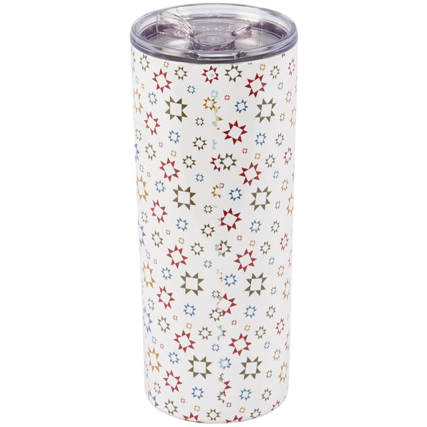 A 20 oz stainless steel coffee tumbler with a full wrap-around design of unique hand illustrated star designs inspired by quilt patterns. Star designs are replicated from original hand illustrated art.