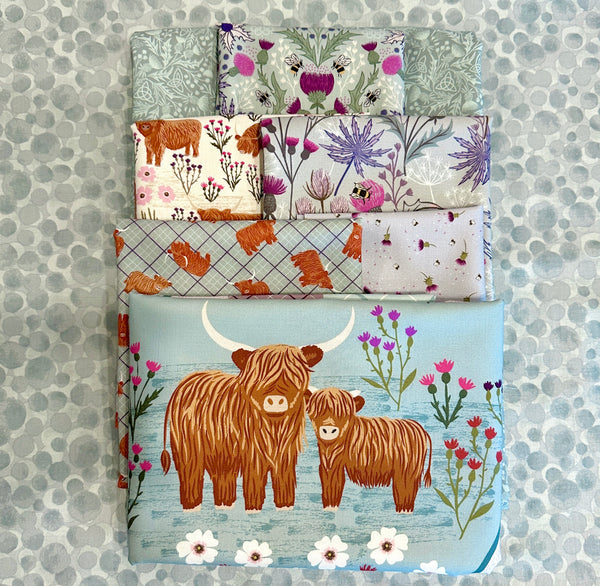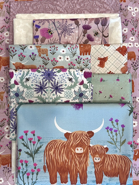This quilt is designed to highlight the beautiful one yard panel which features four individual squares, each showcasing a Highland cow framed by florals.