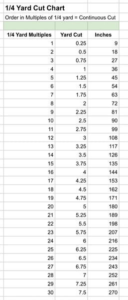 Fabric will be cut in continuous yardage when multiple "1/4 yards" are ordered. See included chart for reference. eg. 4x = 1 yd, 7x = 1 3/4yd, etc. (This is to help us maintain the most accurate inventory.)